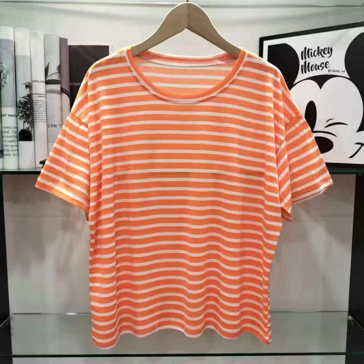 蓝色条纹纽扣设计感短袖T恤女2025夏季新款半开领宽松显瘦上衣,橙色只有十...