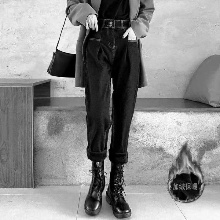 冬季大码女装胖妹妹净版简约加绒加厚设计款洗水棉牛仔老爹哈伦裤,独立包装...