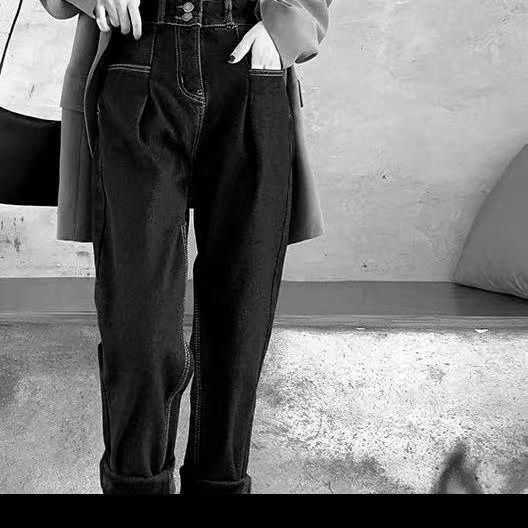 冬季大码女装胖妹妹净版简约加绒加厚设计款洗水棉牛仔老爹哈伦裤,独立包装...