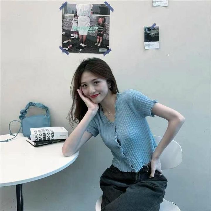 夏季新款女装法式v领木耳边设计感百搭弹力修身针织短袖,独立包装,均码面...