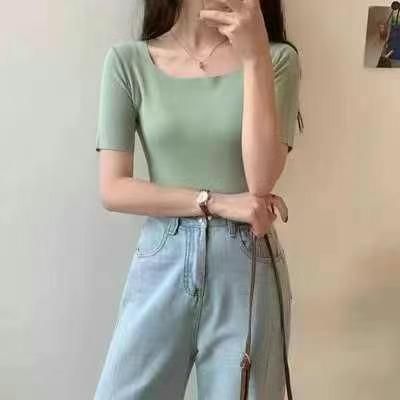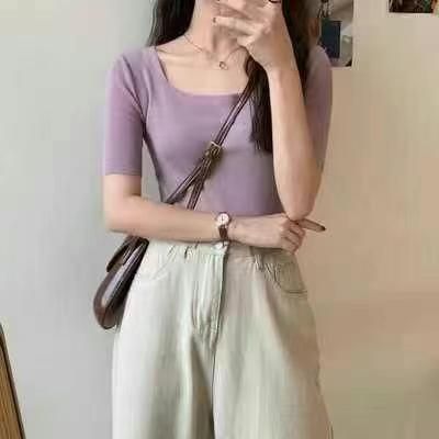 夏季新款简约方领冰丝曲珠纯色薄款针织短袖T桖,独立包装,均码面料柔软舒...