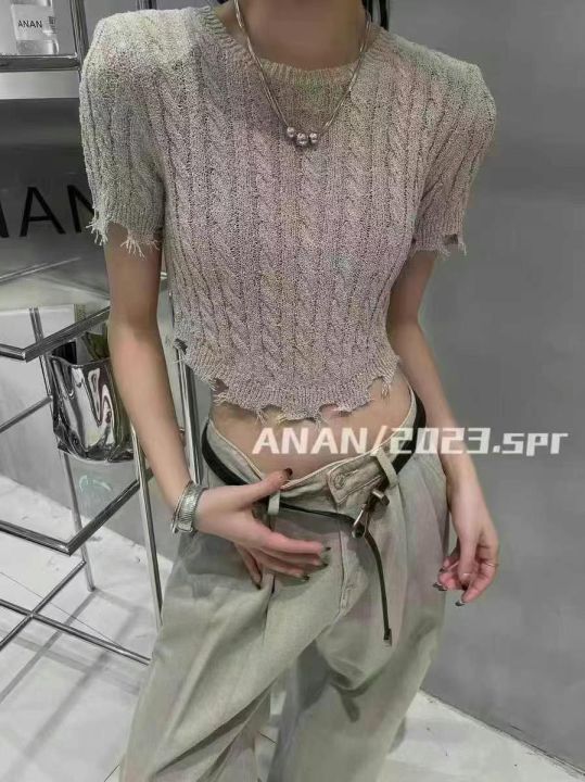 夏季新款纯欲风设计感流苏独特别致麻花短袖短款针织小衫,独立包装,短款多...
