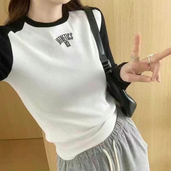 【943 款】撞色短款修身打底衫女秋季新款内搭螺纹长袖T恤 148 件,单款三色...