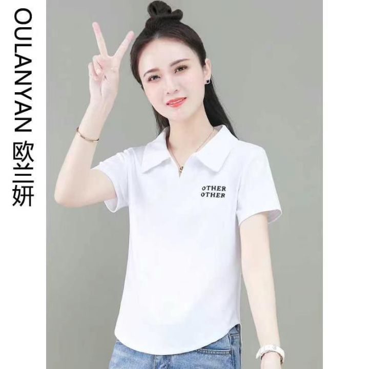 ☆夏季新款女刺绣休闲polo衫,宽松舒适洋气正肩polo翻领短袖上衣,拉架棉面...