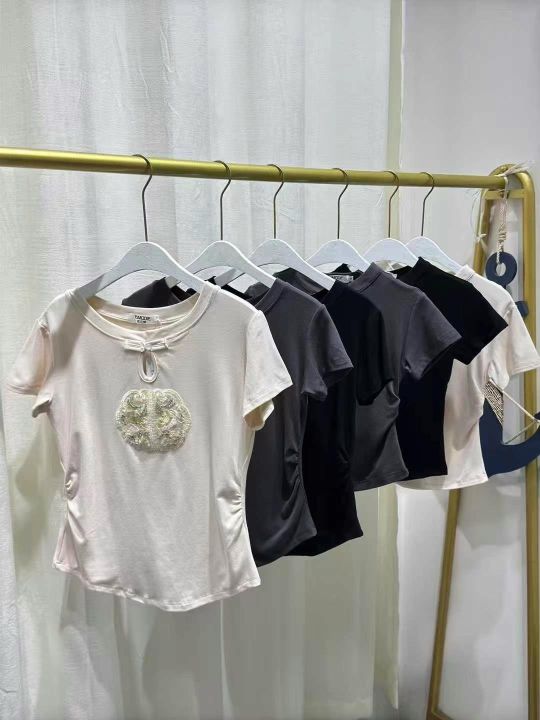 新中式国风刺绣盘扣纯棉短袖T恤女装夏季气质设计感修身显瘦短款上衣,(刺...