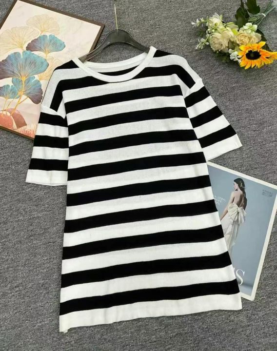 夏季新款宽松慵懒风条纹大码韩系洋气针织短袖T桖,独立包装,均码宽松款,...