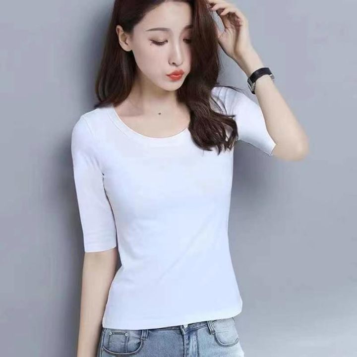 【902 款】 冰丝高档纯色百搭短袖t恤女中袖五分袖体恤打底衫修身显瘦上衣潮...