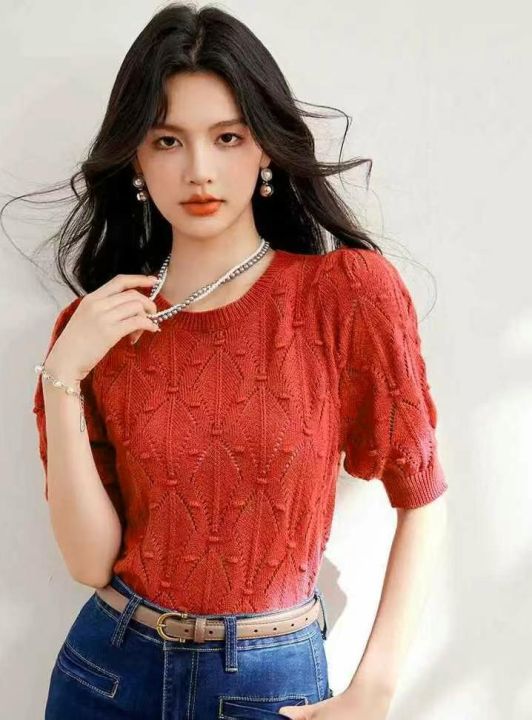 夏季新款泡泡袖镂空织花时尚百搭显瘦针织短袖,独立包装,均码面料柔软舒适...