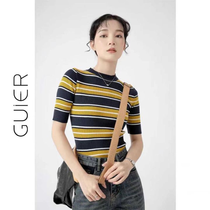 捡漏款,夏季新款法式复古洋气气质弹力修身百搭撞色条纹针织衫T恤,独立包...