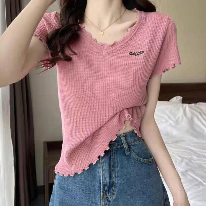 捡漏款,夏季新款刺绣法式甜美透气木耳边冰丝短袖针织t恤,独立包装,均码...