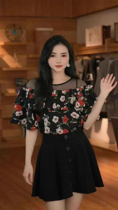 [嘴唇]性感网纱雪纺小衫,夏季彩色拼接短袖假两件百搭雪纺上衣,数量561件...