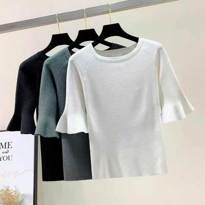 冰丝打底衫 女2025新款修身薄款荷叶边七分短袖 喇叭袖针织上衣。数量215条...