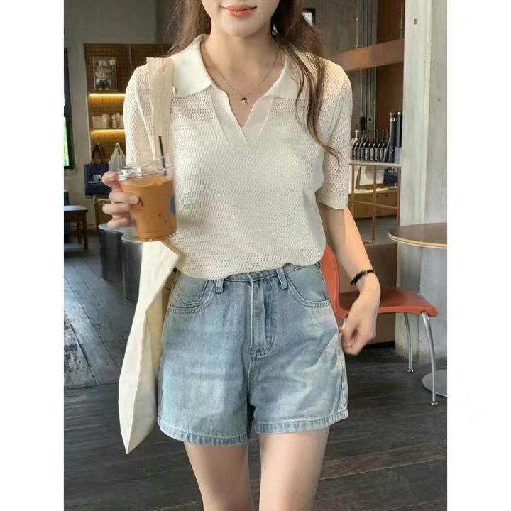 夏季新款宽松显瘦百搭休闲慵懒风气质POLO领纯色镂空针织短袖T恤,独立包装...