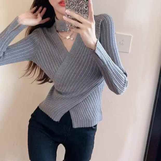 春秋新款公司原单网红不规则V领设计款机镂空挂脖坑条长袖套头毛衣,独立包...