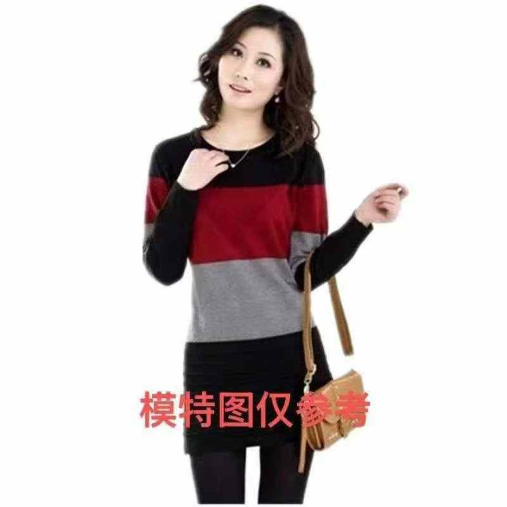 春秋中年妈妈装针织圆领中长款条纹长袖毛衣打底衫,单款单色,高弹力,品质...