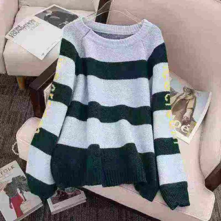 女装秋冬款复古撞色条纹ins港风大版厚重宽松毛衣针织衫上衣,独立包装,均...