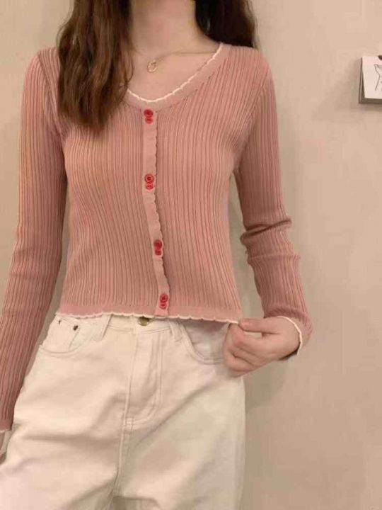 秋季新款木耳边设计款韩版V领镂空百搭长袖针织毛衣开衫,独立包装,单款多...
