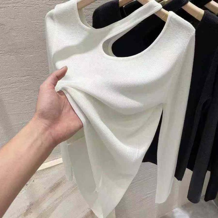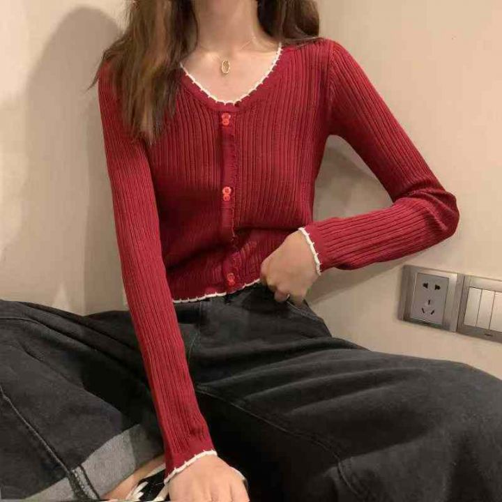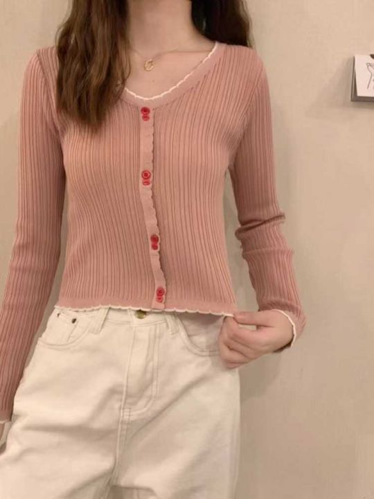 秋季新品法式小众复古设计感V领单排扣针织长袖T恤,独立包装,面料柔软舒适...