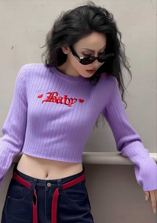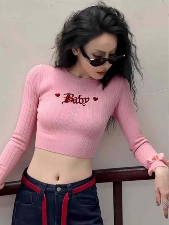 秋季新品纯欲甜辣短款字母刺绣针织长袖圆领套头毛衣,独立包装,均码面料柔...