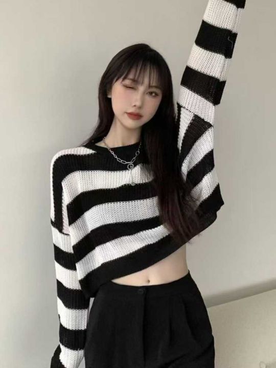早秋新款靓妹短款宽松撞色黑白条纹针织长袖小衫,带配饰有垫肩(个别没有配...