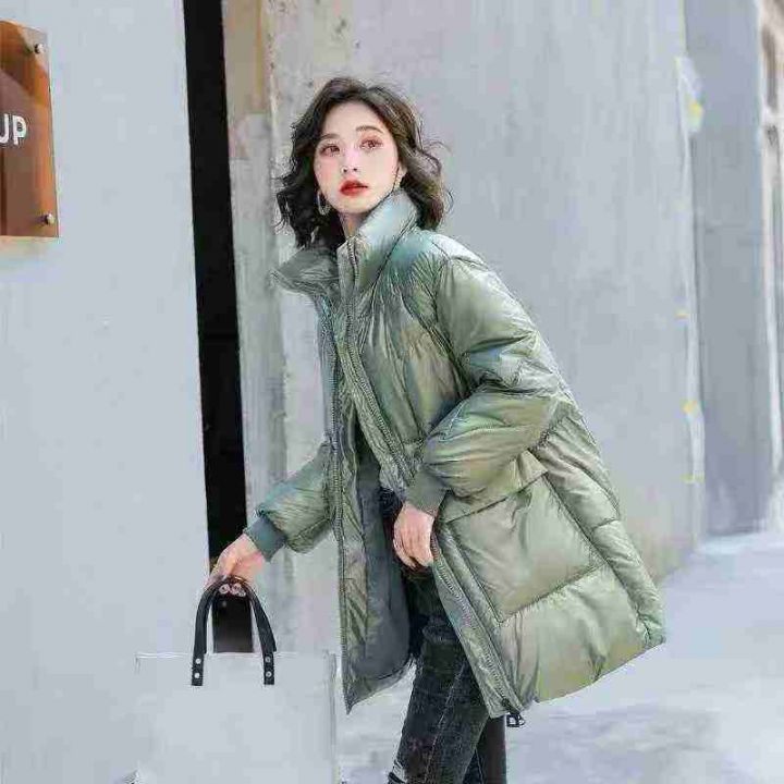 免洗棉服女亮面,韩版棉衣女中长款冬季宽松加厚连帽羽绒棉外套,独立包装,...