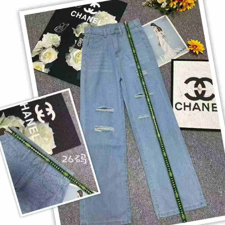 春夏季新款品牌原单宽松半松紧腰破洞设计款直筒阔腿牛仔裤,独立包装带吊牌...