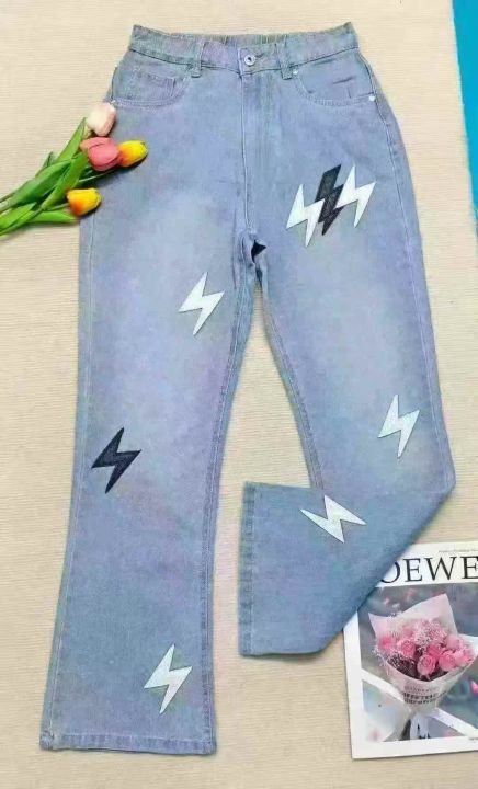 水洗棉直简微喇叭长裤松紧腰美式潮牌宽松闪电皮刺绣牛仔裤,488件,S-2XL,...