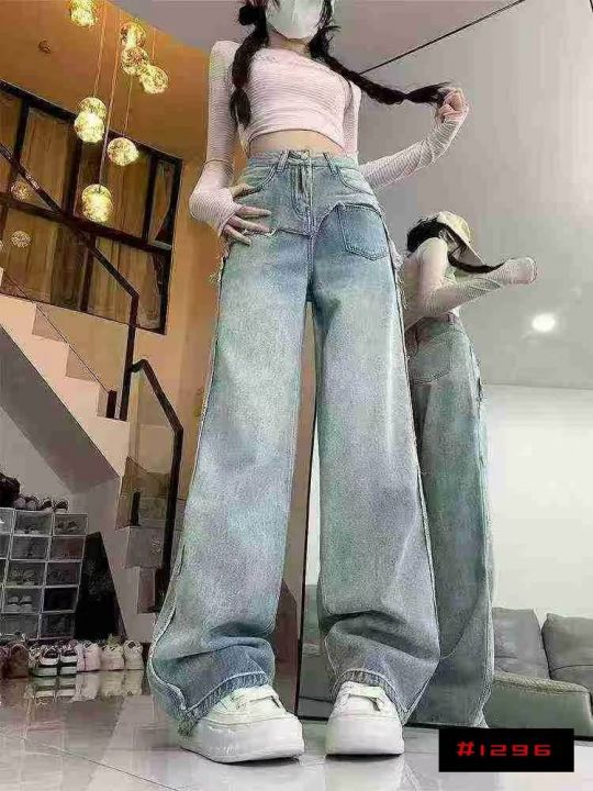 ☕️63033# 美式拼接毛边阔腿牛仔裤女秋季新款高腰宽松显瘦直筒长裤 350条...