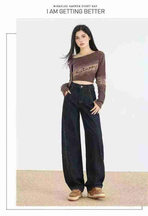 美式复古水泥灰直筒牛仔裤女高腰宽松垂感阔腿裤子,单款单色,独立包装带腰...