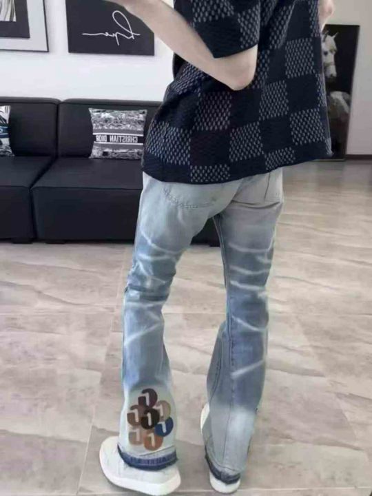 春秋新款网红美式复古水波纹渐变色刺绣毛边微喇叭男女同款宽松牛仔裤,独立...