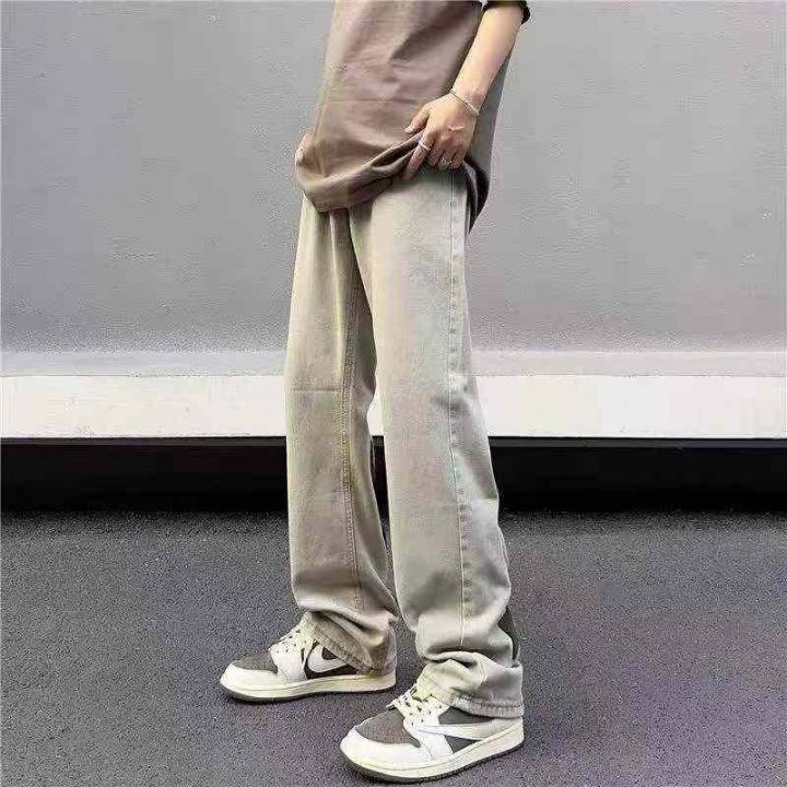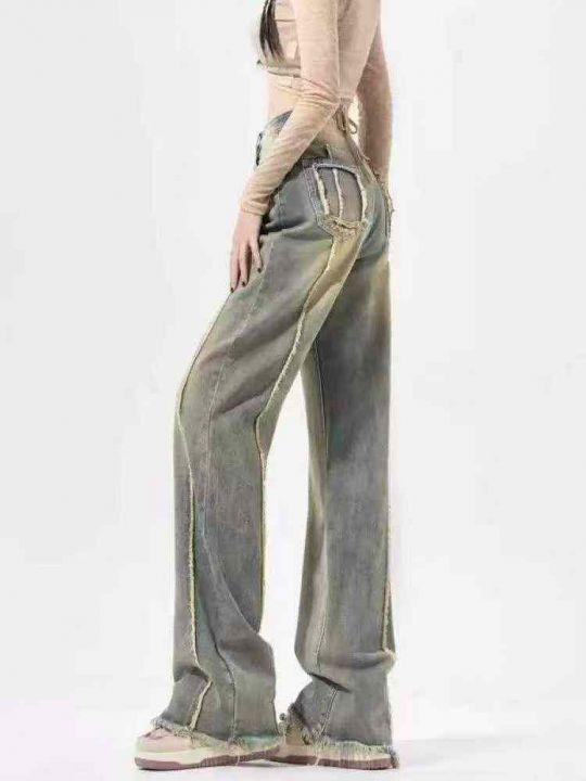 秋冬新款洗水棉网红高街高腰美式复古辣妹直筒黄泥染牛仔阔腿裤,独立包装带...