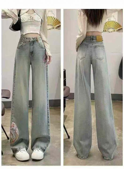 秋季新款洗水棉网红复古国风刺绣直筒阔腿牛仔长裤,独立包装带吊牌,码数XS...