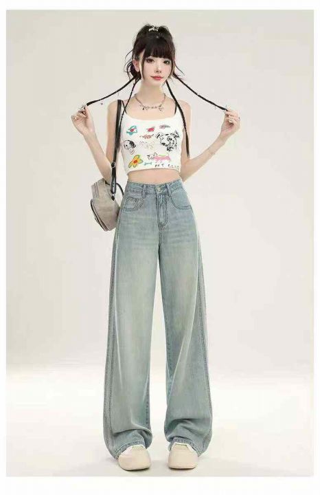秋季新品洗水棉浅蓝色宽松阔腿高腰显瘦牛仔裤,独立包装带吊牌带防伪扣,码...