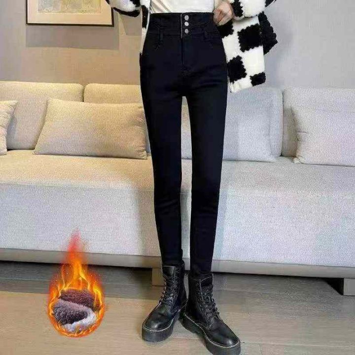 冬季新款洗水棉网红多扣黑色高弹力加绒加厚牛仔铅笔裤,独立包装带吊牌,码...