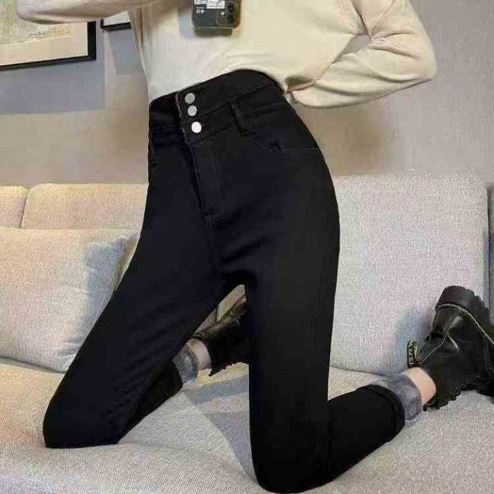 冬季新款洗水棉网红多扣黑色高弹力加绒加厚牛仔铅笔裤,独立包装带吊牌,码...