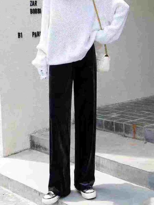 ☕️黑色金丝绒阔腿裤女秋冬加绒加厚直筒裤慵懒高腰显瘦休闲裤,带蕾丝裤脚...