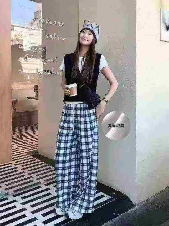 全清价6.9元气质薄绒直筒格子裤宽松显瘦高腰秋裤,独立包装,模特图仅供参...