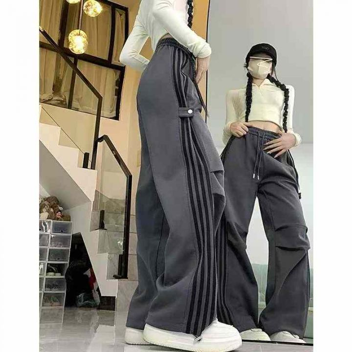 秋冬加绒美式复古阔腿条纹卫裤直筒宽松休闲工装束脚运动长裤子,全部加绒,...