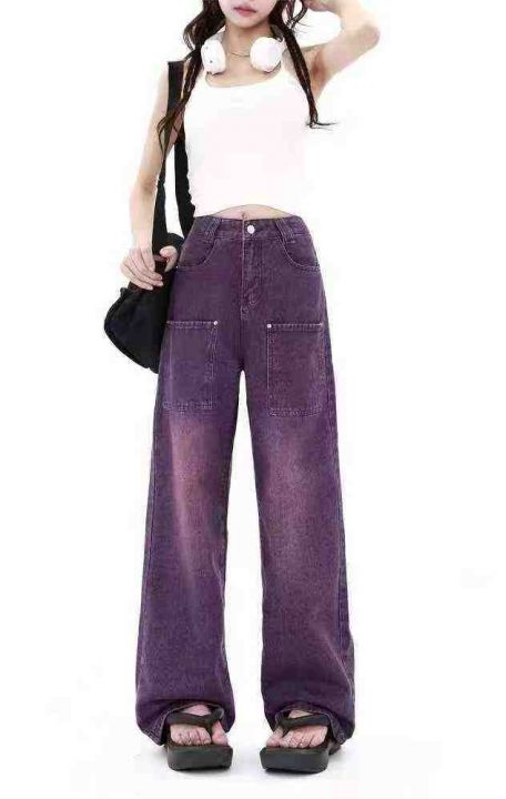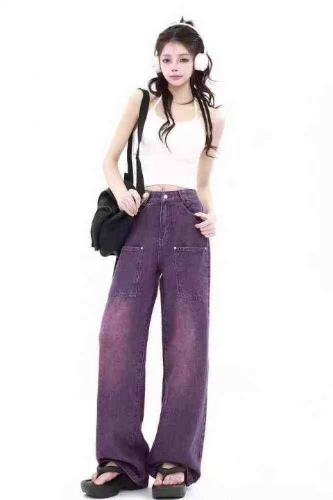 秋季新品洗水棉美式复古紫色宽松显瘦垂感直筒阔腿牛仔裤,独立包装带吊牌,...