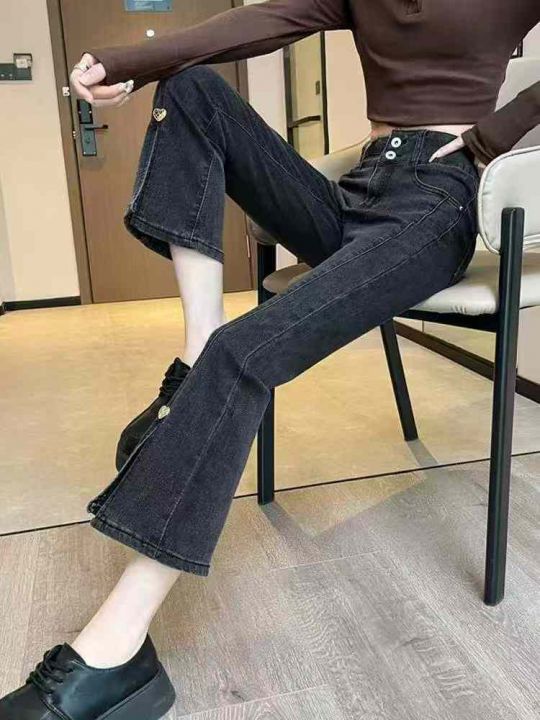 秋季新款高弹力设计感爱心开叉高腰显瘦九分微喇叭牛仔裤,独立包装带腰卡,...