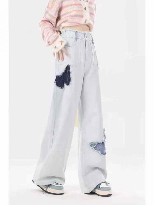 天猫精选1800条 时尚洋气国潮蓝色蝴蝶刺绣毛边阔腿牛仔裤女,单款单色S~XL...