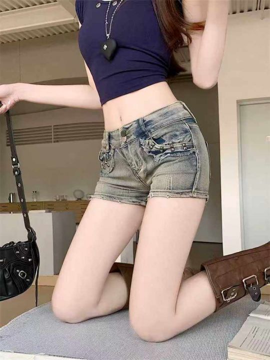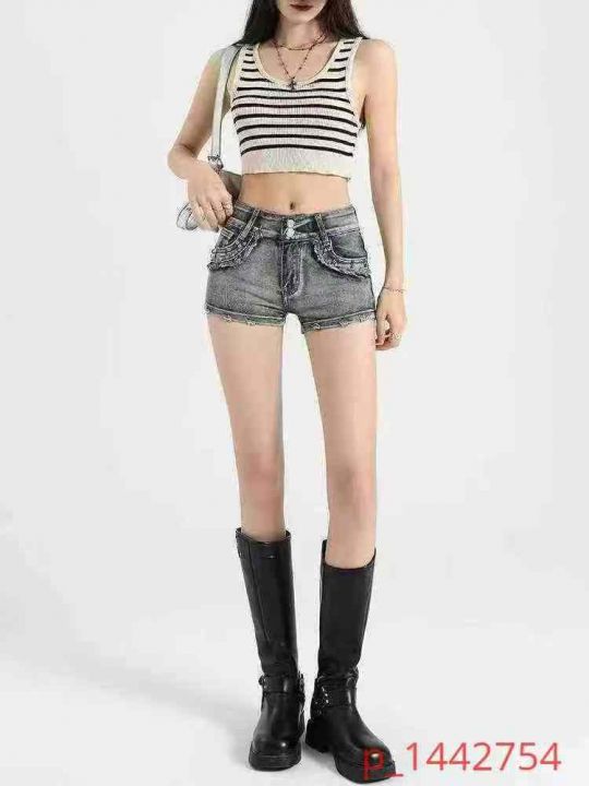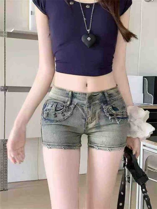 夏季新款港味设计感性感辣妹绑腿弹力修身显瘦百搭洗水棉牛仔短裤,独立包装...