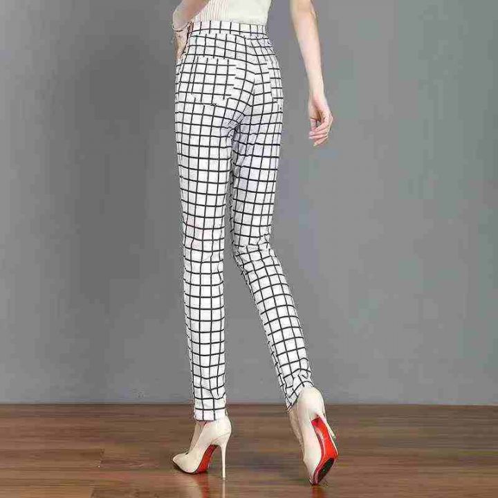 松紧腰黑白格子印花大码2025秋装新款弹力翠花显瘦百搭直筒女长裤,独立包装...