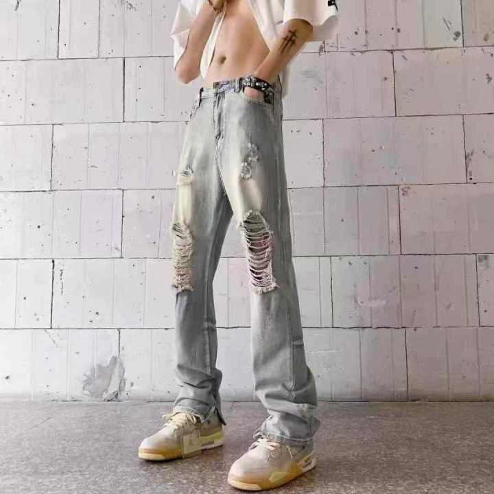 秋季新品复古做旧男女同款美式高街设计感直筒破洞窄版阔腿牛仔裤,独立包装...