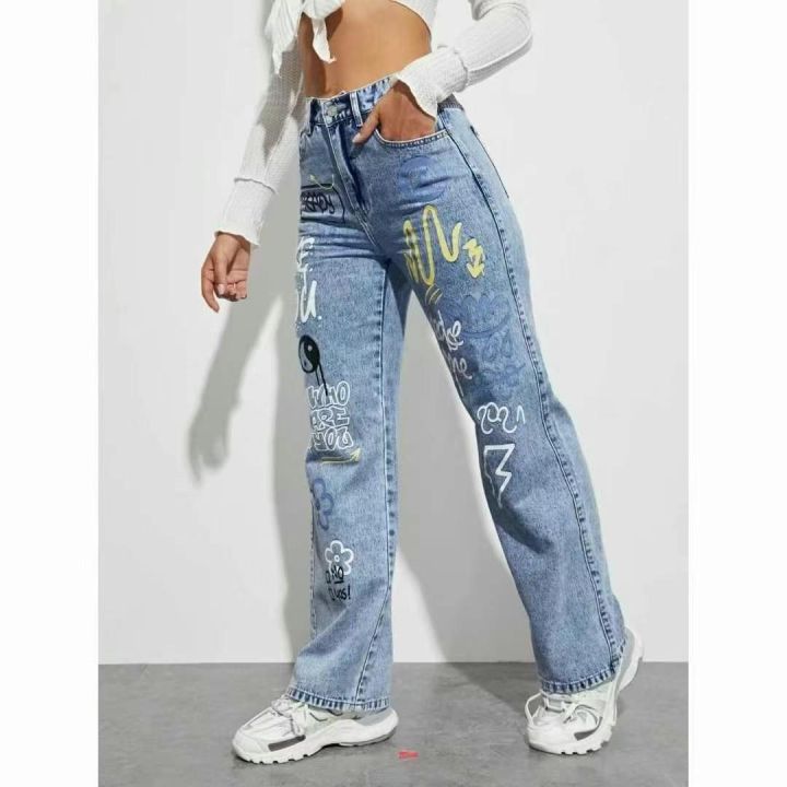 春季新款美式复古涂鸦印花趣味宽松直筒阔腿牛仔裤,独立包装,码数XS-L码,...
