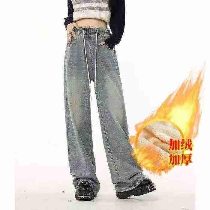 冬季加绒加厚松紧腰刺绣直筒阔腿牛仔裤,工厂货没有包装防水袋装,码数26-3...