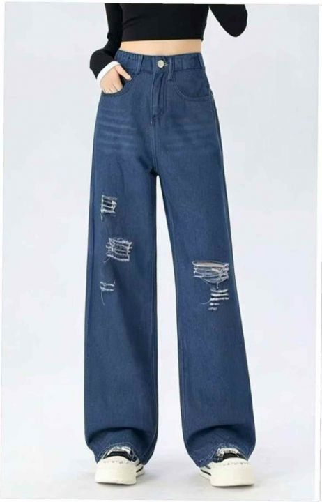 春夏季新款品牌原单宽松半松紧腰破洞设计款直筒阔腿牛仔裤,独立包装带吊牌...