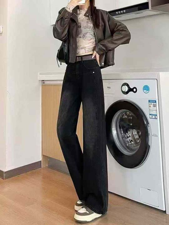 ☕️63033# 美式拼接毛边阔腿牛仔裤女秋季新款高腰宽松显瘦直筒长裤 350条...