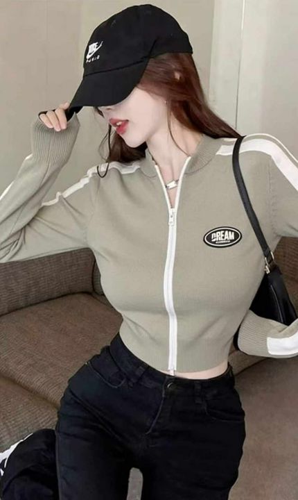 春季新款撞色插肩双头拉链辣妹设计感弹力修身针织毛衣开衫,独立包装,均码...