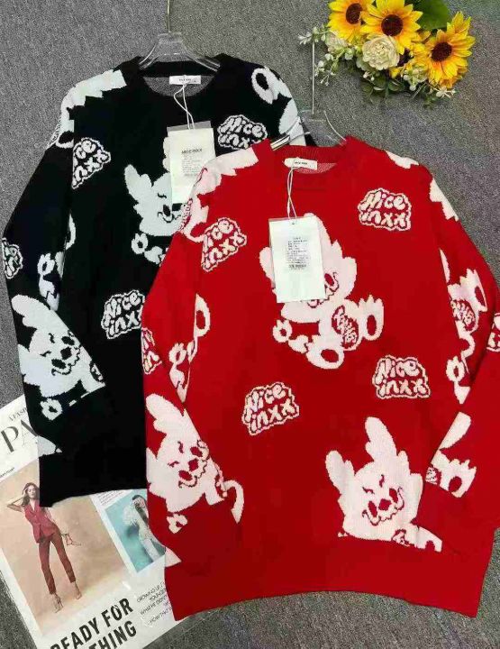 秋冬新款大板落肩宽松慵懒风卡通提花芝麻底2条毛包芯纱套头毛衣,独立包装...